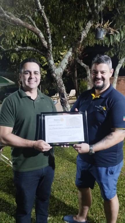 O presidente também homenageou o Coronel Plácido Travassos, que deixa o comando do 1º Batalhão de Comunicações de Santo Ângelo para assumir nova missão em Brasília, agradecendo pelo importante apoio prestado aos diversos projetos do Rotary em prol da nossa comunidade.